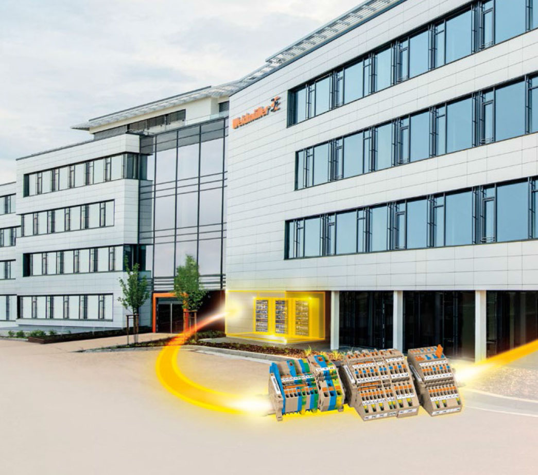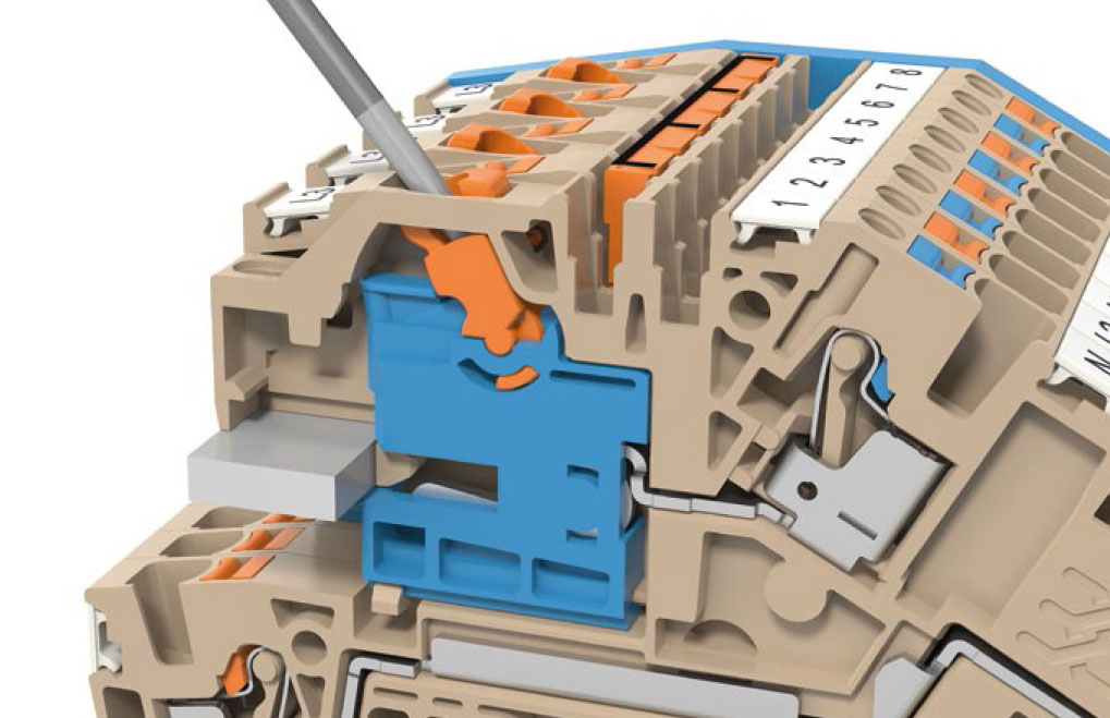 As réguas de bornes com convenientes sistemas de ligação PUSH IN são usadas para coletar e distribuir os potenciais, e assim, mesmo os condutores de fios trançados podem ser conetados, simplesmente ao pressionar o botão colorido.